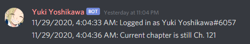 DISCORD_ANIME_ROLE=the role id to mention for anime updates (int) MANGADEX_USERNAME=the Mangadex username used to authorize the bot's access to the API (string)