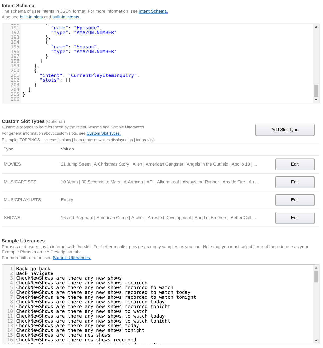 On the next tab, you'll have to paste the alexa.intents file into the "Intent Schema" field, and paste the alexa.utterances file in the "Sample Utterances" field. Generate and save your Slots first before pasting the Intents and Utterances to avoid errors when attempting to save.