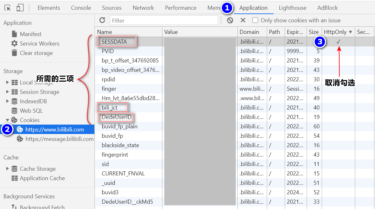 进入Application找到Cookies栏中的SESSDATA将HttpOnly选项取消勾选