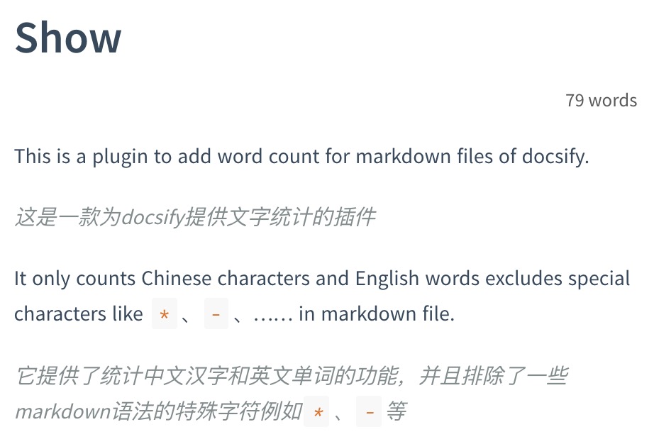 | countable | boolean | 设置字符统计展示与否 Set display this plugin or not | true(默认值Default) / false |