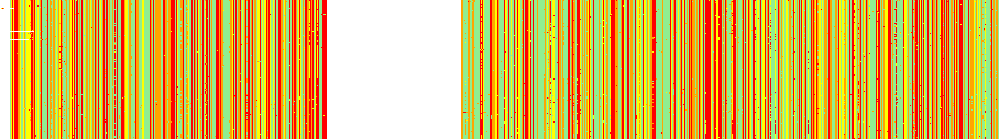 Here we have a much better alignment. This is a typical default configuration for this algorithm (though not MicrobeTrace's default). However, we can still see some bases being dropped in unsequenced regions and, more alarmingly, some sequences near the bottom showing slight shifts, which are very bad. However, the net effects may be within the bounds of analytic accuracy. Your mileage may vary.