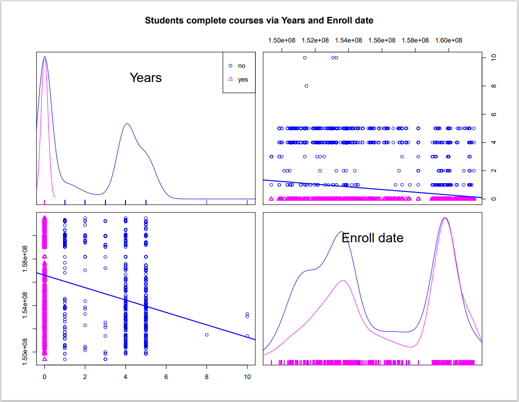 Based on the graph, it seems like the older the students are, the more they will drop the course. Since the courses are harder with grade growing, students have difficulties to assign their limited time to lots of courses' works. On the other hand, the date of enrollment does not affect the complete level. As no matter when the students add the course, the university give them enough time to take a look at how the classes work at the beginning of the semester.