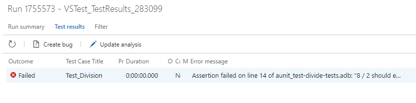 Some screenshots of the TRX file being displayed by vNext (of 1 failing unit test; a succeeding one is less interesting) Note the time the test took is correctly passed on, but vNext doesn't display values below 1 ms (in this case it took around 300 μs). I don't expect AdaCore to be able to test the vNext aspect of this; however, I am sure it will be useful to other users of aunit. |