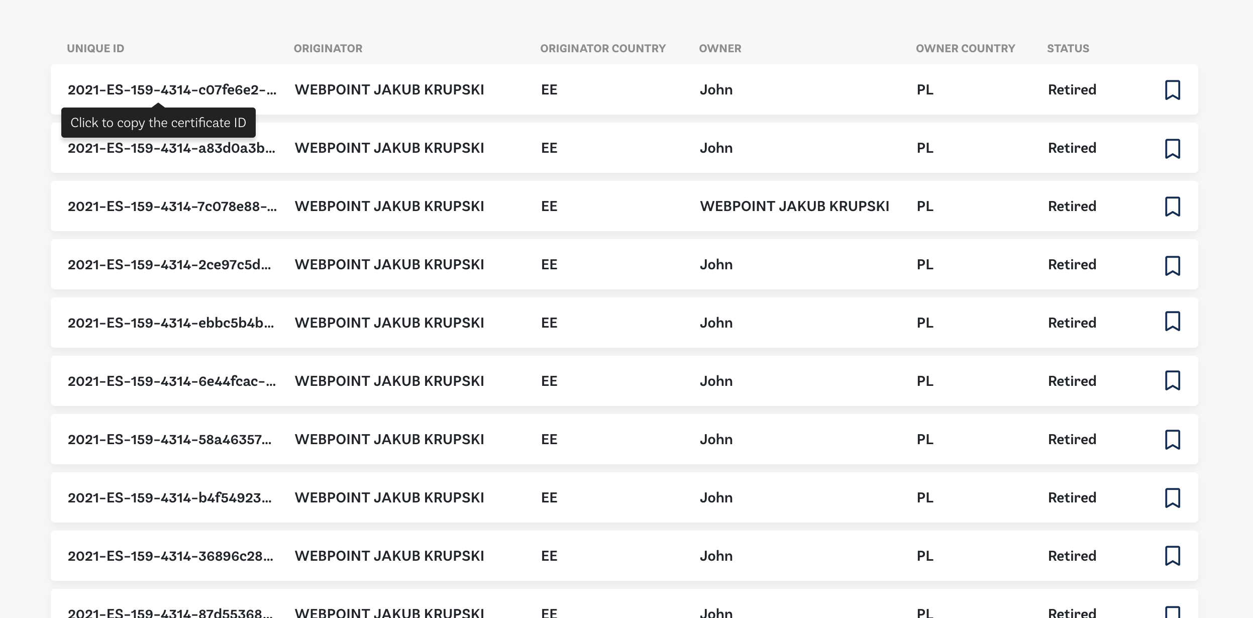 Mockup for the certificates table: