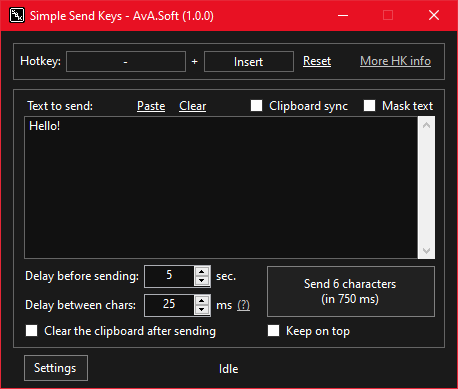 Implement 'Block hotkey propagation' option/setting.(done)Implement 'send' argument for other integrations.(done)Implement 'Keep on top' option/setting.(done)Implement 'Transparency' feature.(done)- Adding the possibility to send modifiers key.