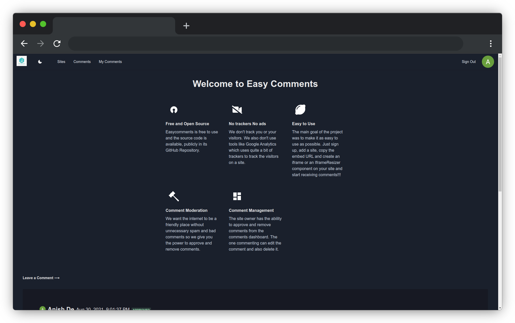 Easy Comments is a simple web app that allows you to add comments functionality to any website, be it a portfolio site or a blog