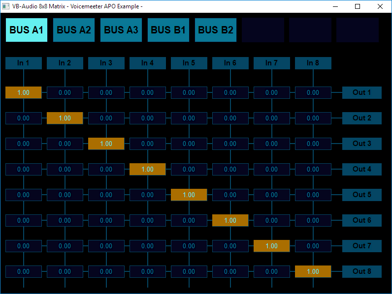 Once you have installed VoiceMeeter Banana and AutoHotKey, download the 8 channel Gain Matrix from the above link. Place both vmr_matrix.exe & button.png inside VoiceMeeter's install directory (default: C:\Program Files (x86)\VB\Voicemeeter). With Voicemeeter Banana running, run vmbutton.ahk The new button should appear like in the above image. For best results, add vmbutton.ahk to your Windows startup folder.