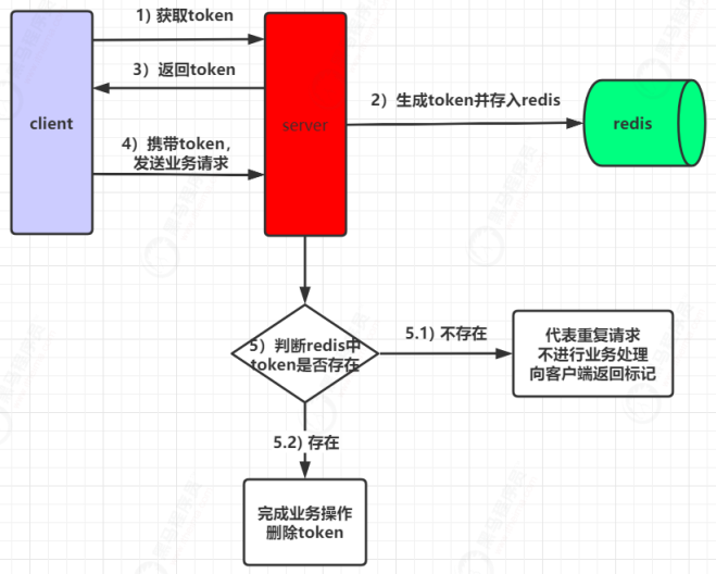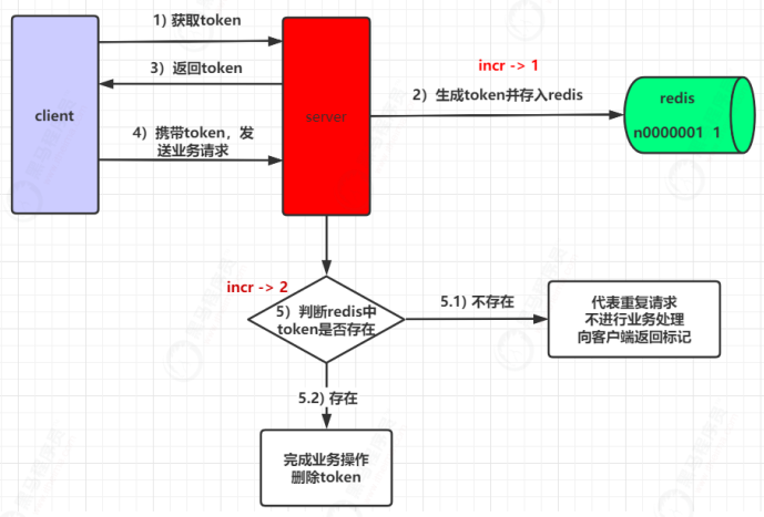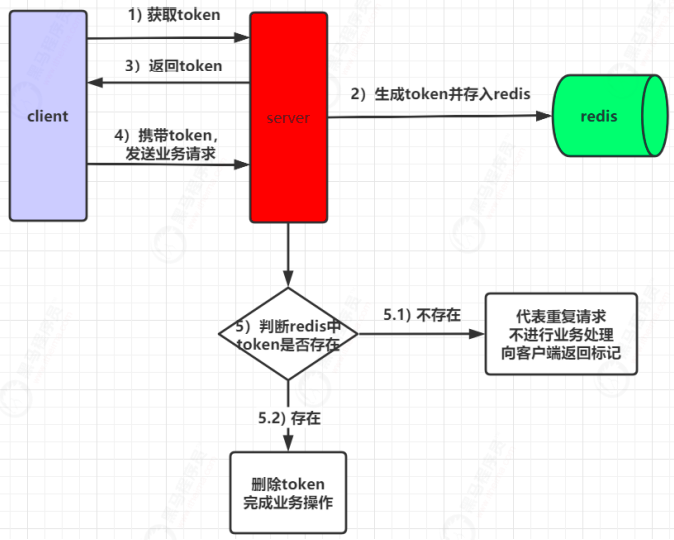 | 107 | +3. 服务端接收到客户端请求后,首先会判断该 token 在 redis 中是否存在。如果存在,则完成进行业务处理,业务处理完成后,再删除 token。如果不存在,代表当前请求是重复请求,直接向客户端返回对应标识。 |