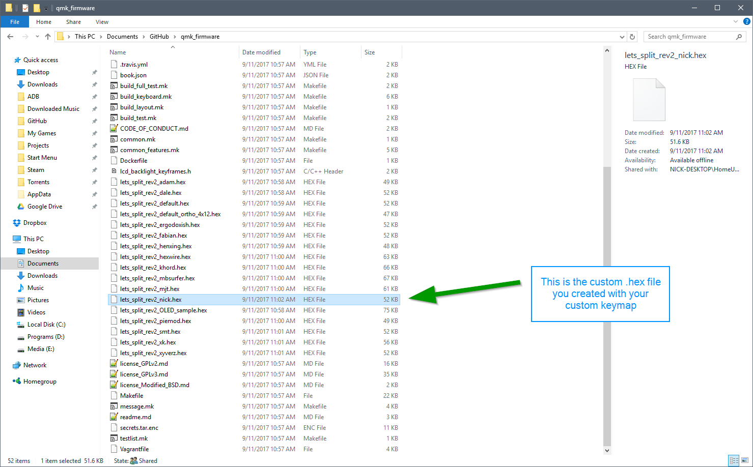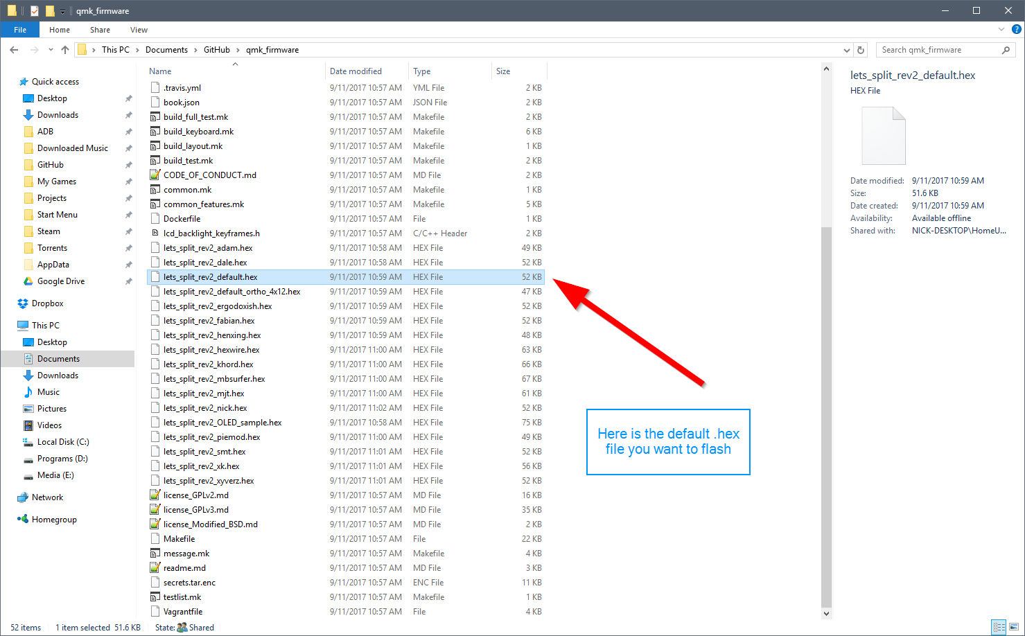 - All you need is your .hex file, so copy that somewhere safe, or you can just drag it in the let’s split folder in QMK