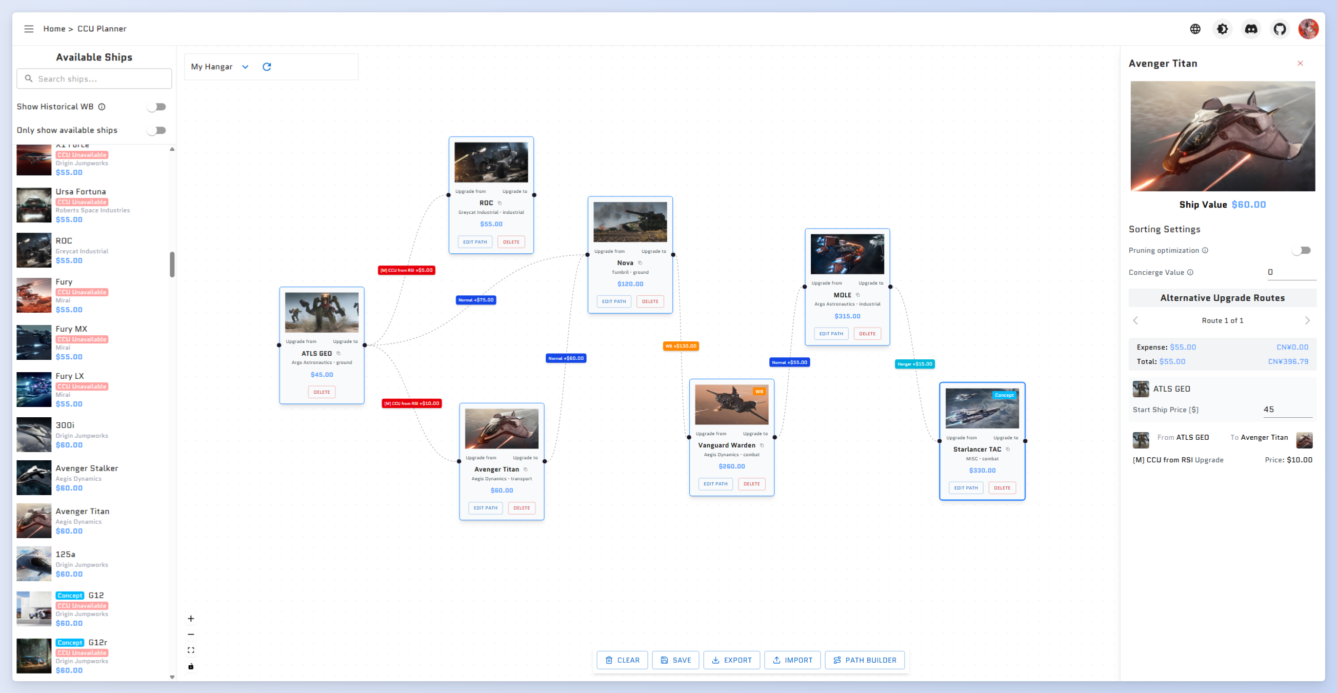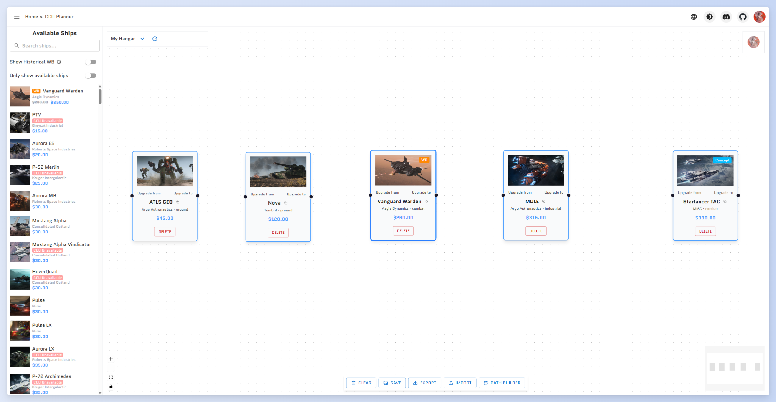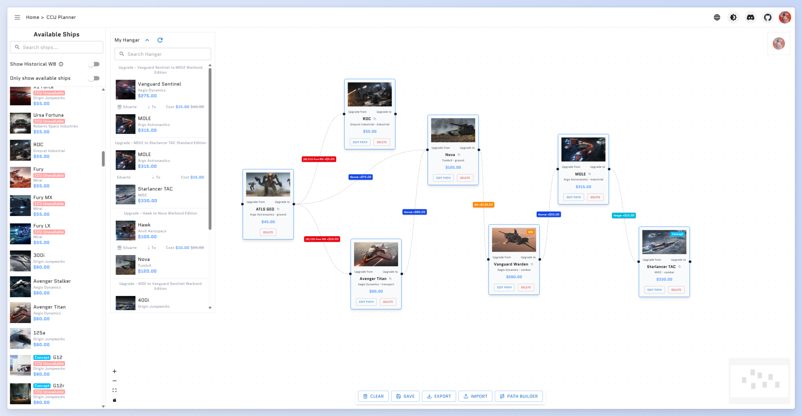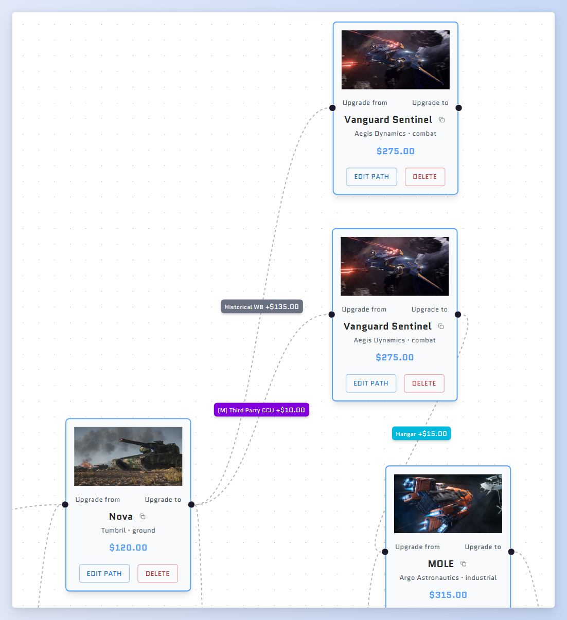 Special reminder: If you need to use historical WBs for your planning, you need to click the edit path button on the ship node card, select historical WB for a certain path. When connecting nodes, only currently on-sale WBs and CCUs in your hangar will be automatically set.