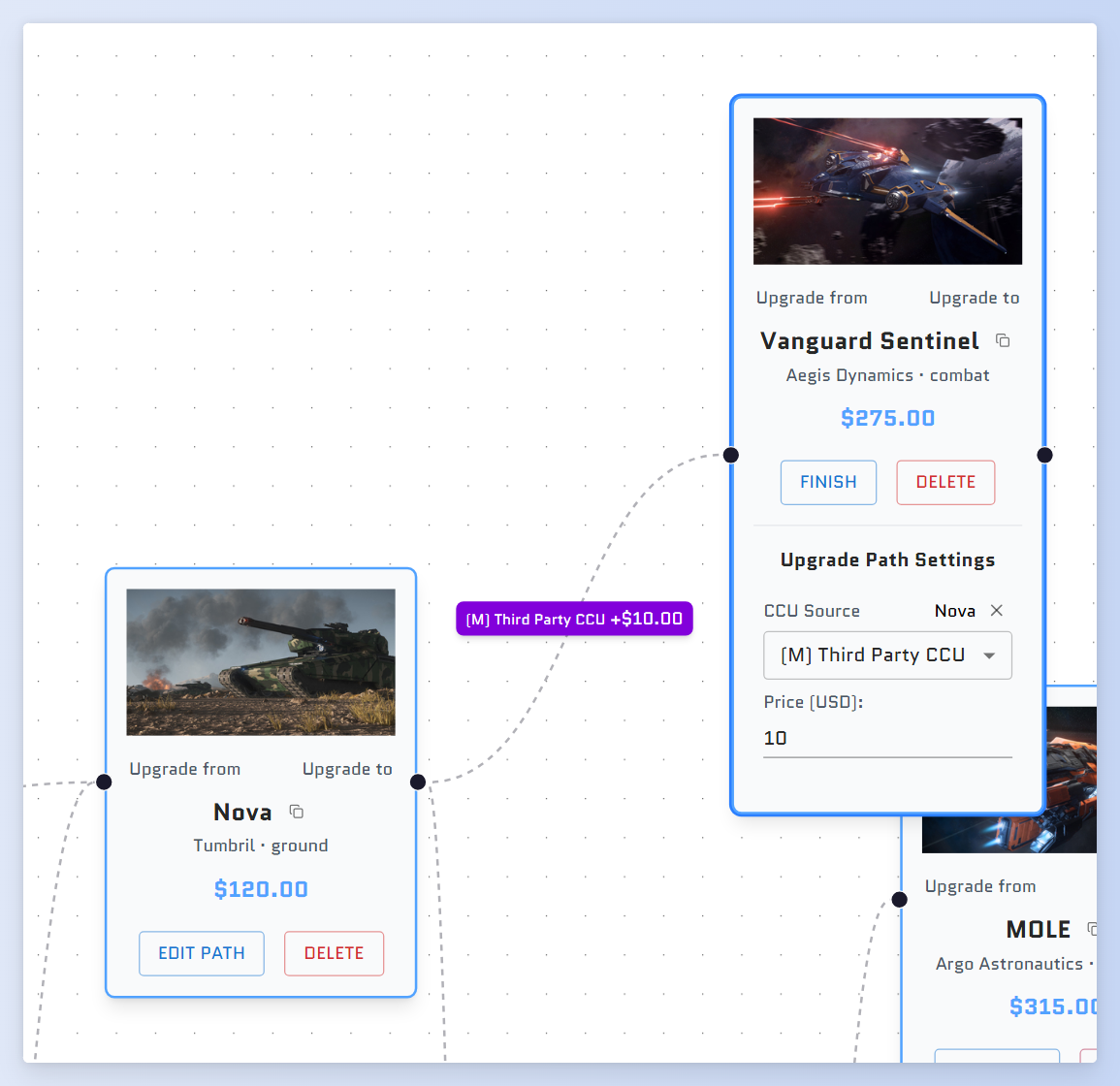 Then you need to click the edit path button on the Vanguard Sentinel node, and then for the incoming link from Nova, select "Manual: Third-party CCU" and set the price to $10.