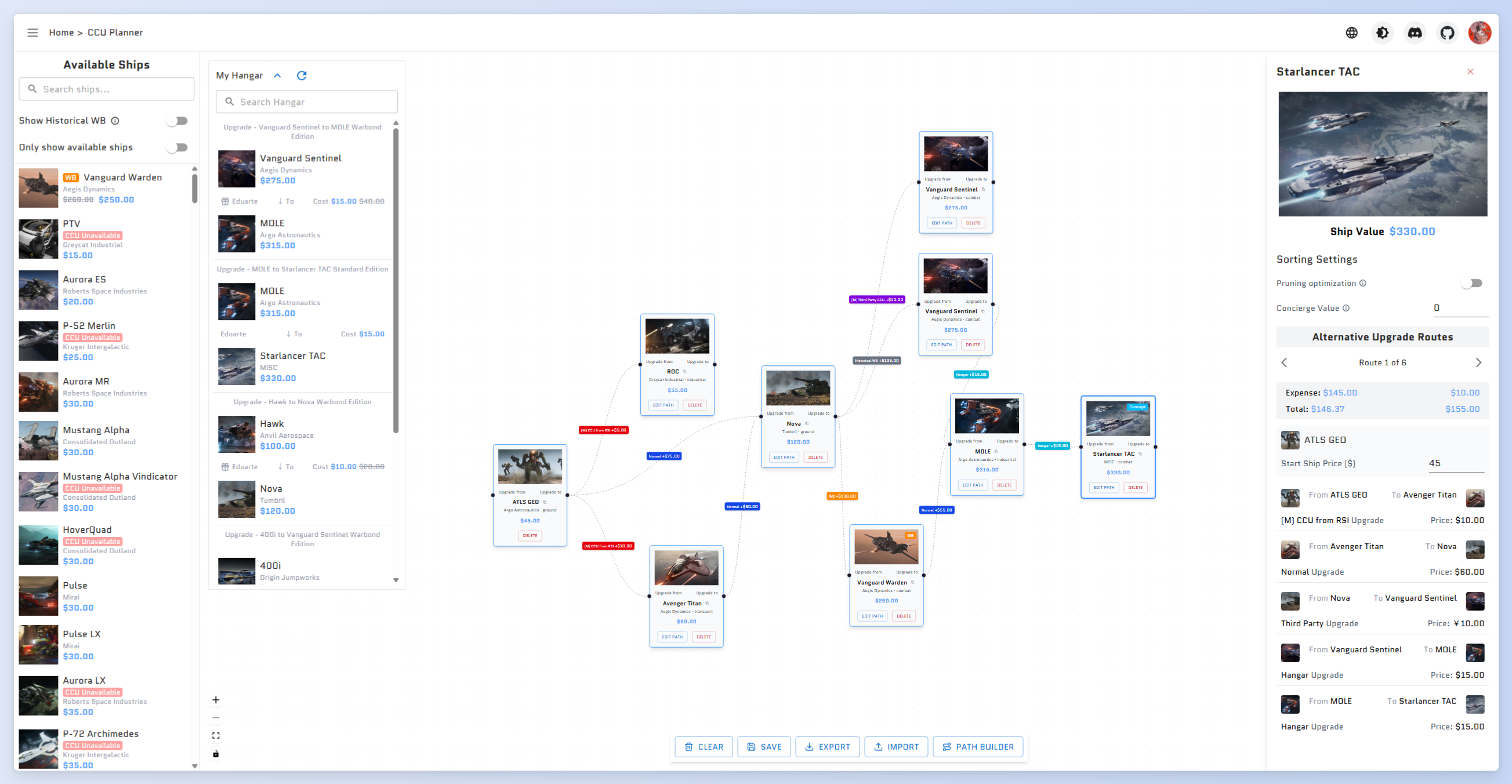 You may have noticed that the historical WB's Vanguard Sentinel node is not connected to the MOLE. Don't worry! This route will also be included in the calculation when you finally view the upgrade route for the Starlancer TAC. You just need to ensure that a node corresponding to the current ship has a connection created.