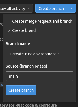 After creating the ticket you can click on it in the list view. It will show you the description and any activity regarding the issue. It will also show a blue button "Create merge request" or "Create branch" (the name changes according to options). Click on the dropdown arrow on the right of the button, select "Create branch" and then click the blue button "Create branch" (see screenshot). This will create a branch for you in the repo. You can now check it out locally and start adding your code: