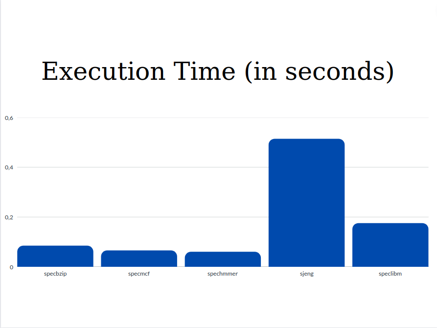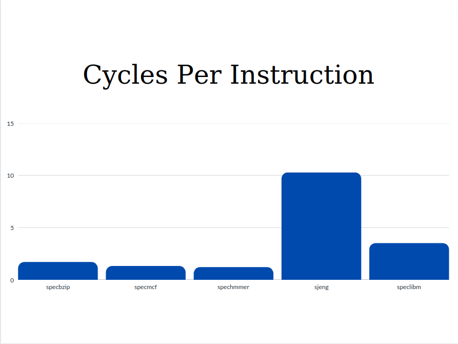 stats.txtfiles:Parameters specbzip specmcf spechmmer sjeng speclbm Execution time 0.083982 0.064955 0.05936 0.513528 0.174671 CPI 1.679650 1.299095 1.187917 10.270554 3.493415 L1 Instruction cache miss rates 0.000077 0.023612 0.000221 0.000020 0.000094 L1 Data cache miss rates 0.014798 0.002108 0.001637 0.121831 0.060972 L2 cache miss rates 0.282163 0.055046 0.077760 0.907550 0.999944 Below are presented the plots for each parameter comparing each benchmark: