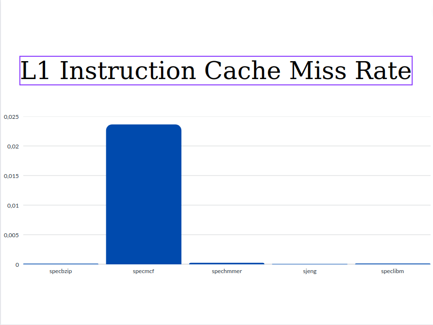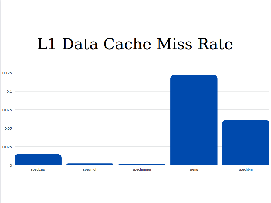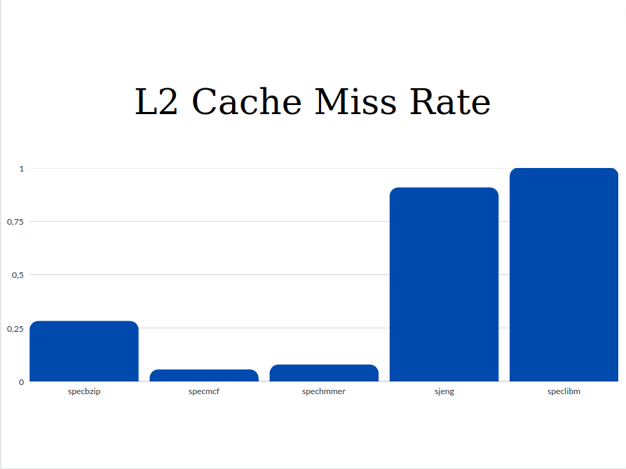 From the graphs we can see that the values of Execution Time and Cycles per Instruction are significantly higher for the sjeng and speclibm benchmarks. This happens because as we see from the miss rates below, these two benchmarks are the only ones with two out three high miss rates (l1 data chache miss rate and l2 cache miss rate). The miss rates as well as the respective access time affect the CPI. So with higher miss rates, higher CPI and Execution Time are expected.