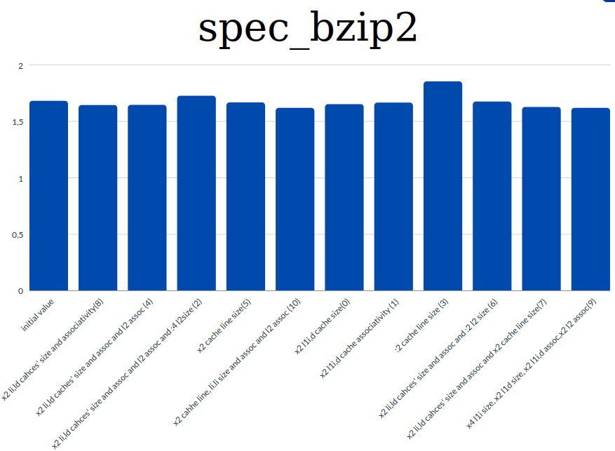 - specbzip: 5496.0587 -> x2 cache line size and l1 size, assoc and l2 assoc