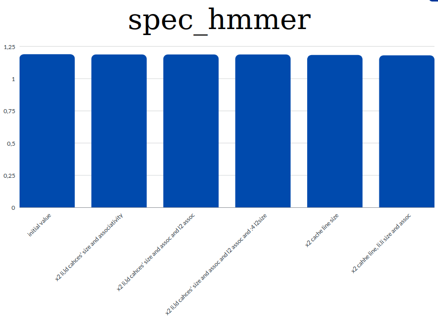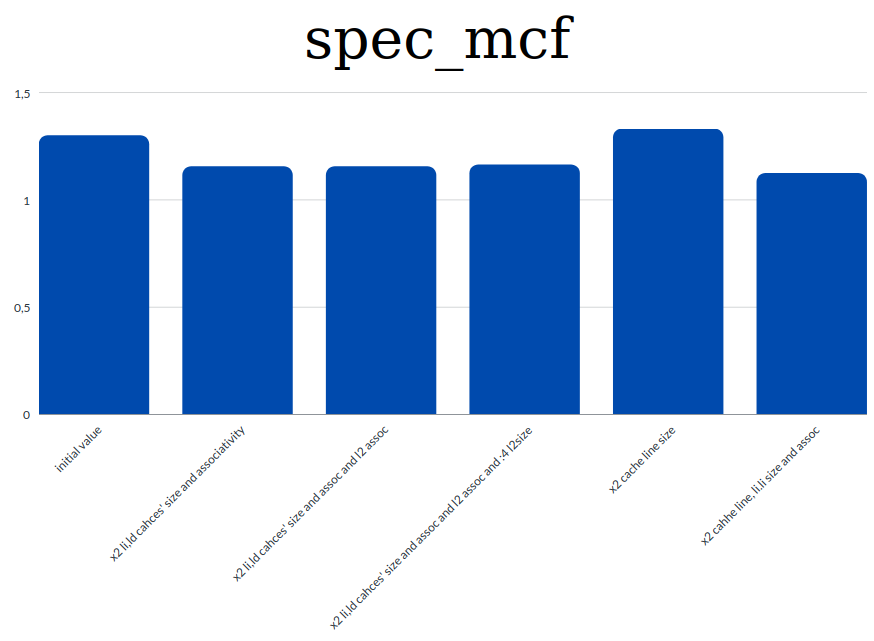 - specmcf: 1493.1104 -> x2 cache line size and l1 size, assoc and l2 assoc