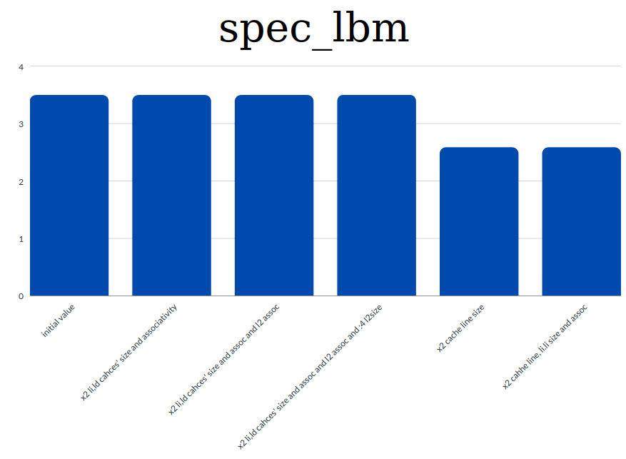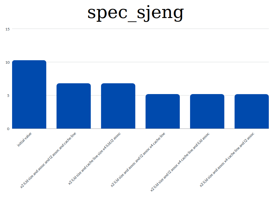 - sjeng: 423.309343 -> x4 cache line size and l2 assoc and x2 l1 size, assoc