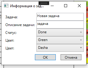 При нажатии на кнопку изменить открывается дополнительное окно, в котором можно изменить заголовок и описание задачи, выбрать статус и цвет тега, а также исполнителя. (Статус, цвет тега и исполнитель выбираются из выпадающего меню).