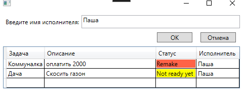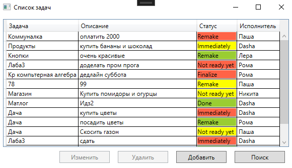 На главном экране при нажатии на кнопку "Поиск" открывается дополнительное окно, в которм можно ввести имя пользователя и получить все задачи, связанные с ним.