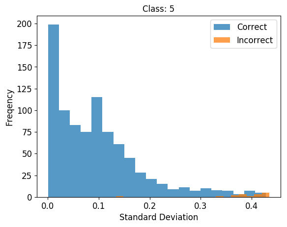 The following are examples of the distributions of the standard deviations associated with each class, when making correct and incorrect predictions: