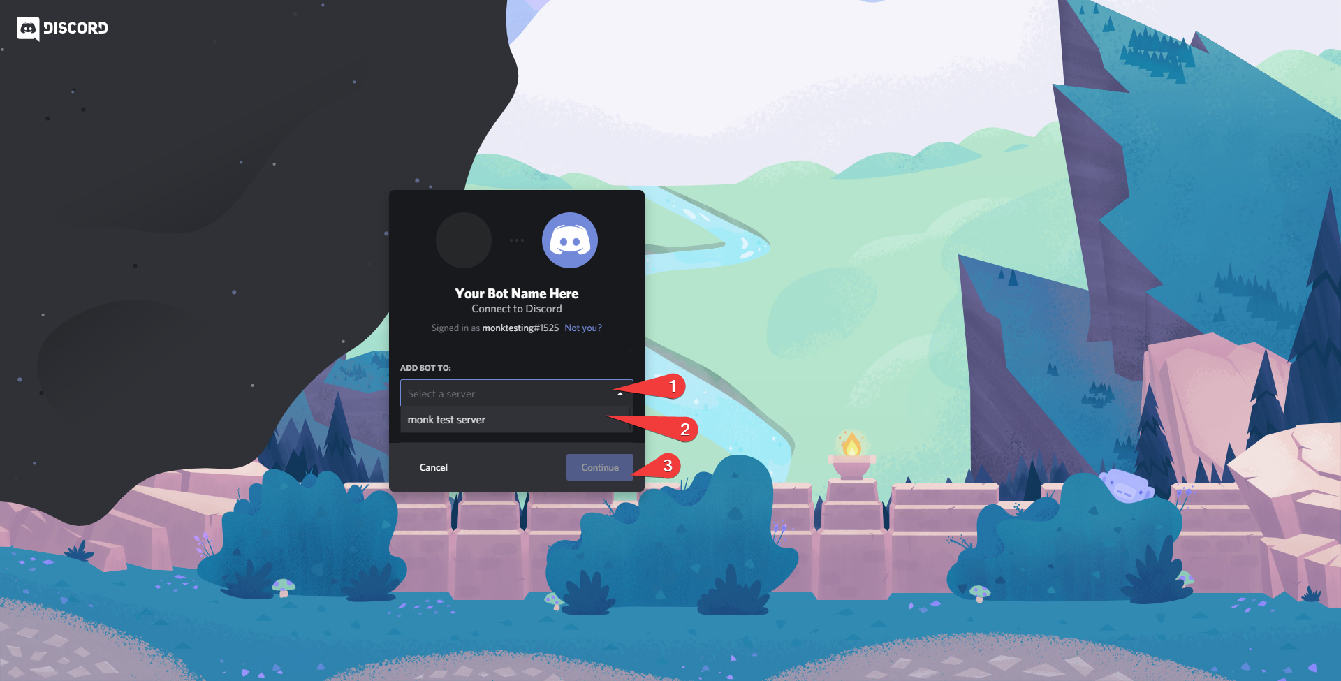 Then go to your web browser and paste the invite link there. Choose which server you want to invite the bot to and click Continue.