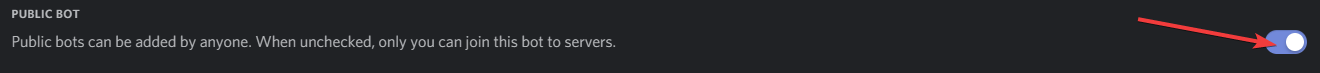 If you want to make it so only you can invite the bot (e.g. if it's a custom bot for your server), just click the slider under Public Bot: