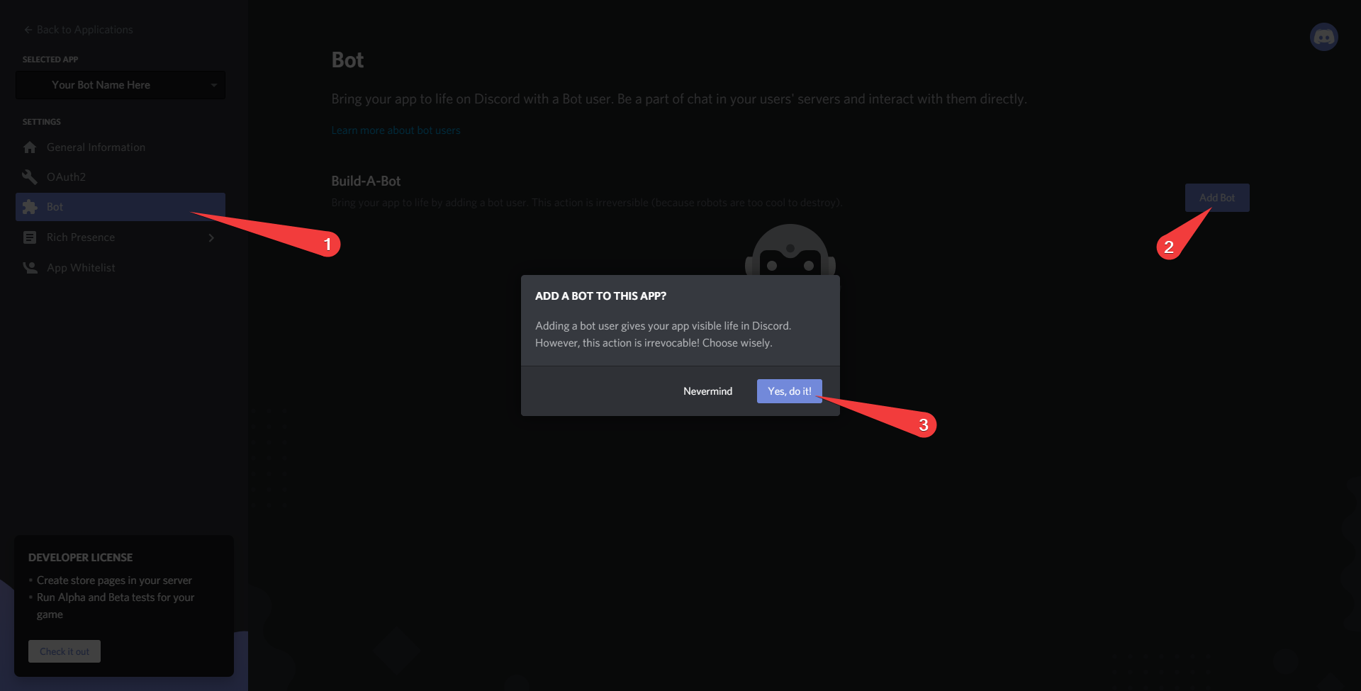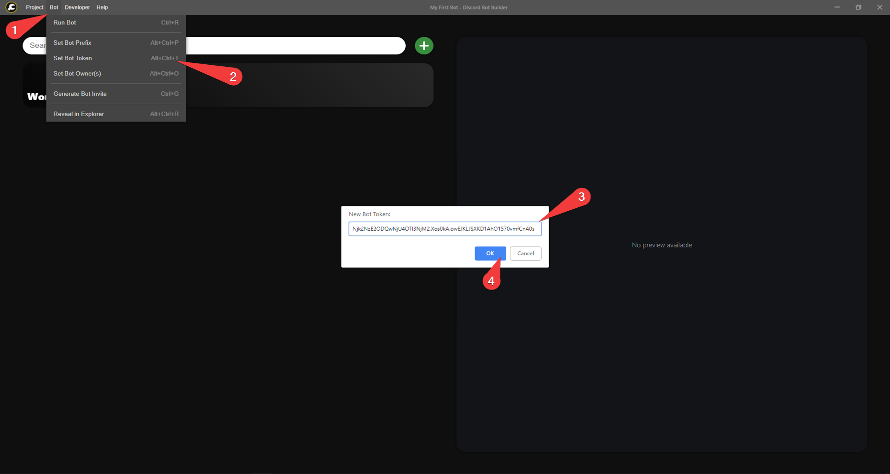 Input it into DBB. Do this by selecting the Bot menu in the toolbar at the top of the screen and selecting Set Bot Token. (you could also do the keyboard shortcut Ctrl + Alt + T.) Then paste the token and hit Enter or click OK.