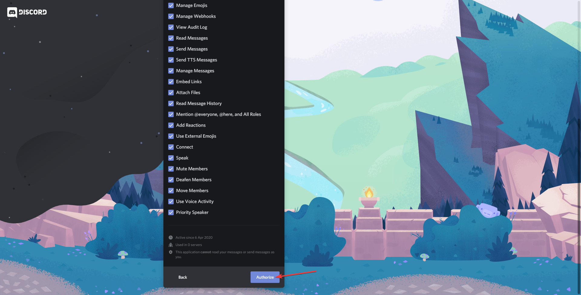 On the next page, a huge list of permissions will come up. Change them as you wish. Scroll down to the bottom (there will be some information about your bot) and click Authorize.