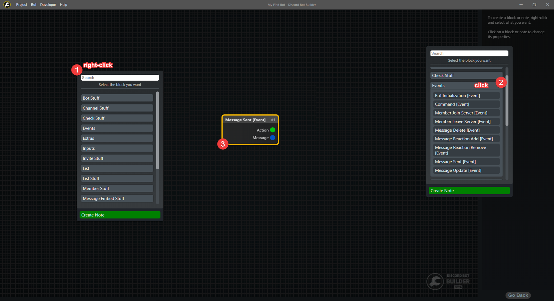 If you right-click on any empty spot in the workspace, the Blocks menu comes up. In the Events tab, there are some blocks so the bot can execute an action. In these docs, I will use the Message Sent Event block to execute an action whenever the bot receives a message (either in the server or its DMs).