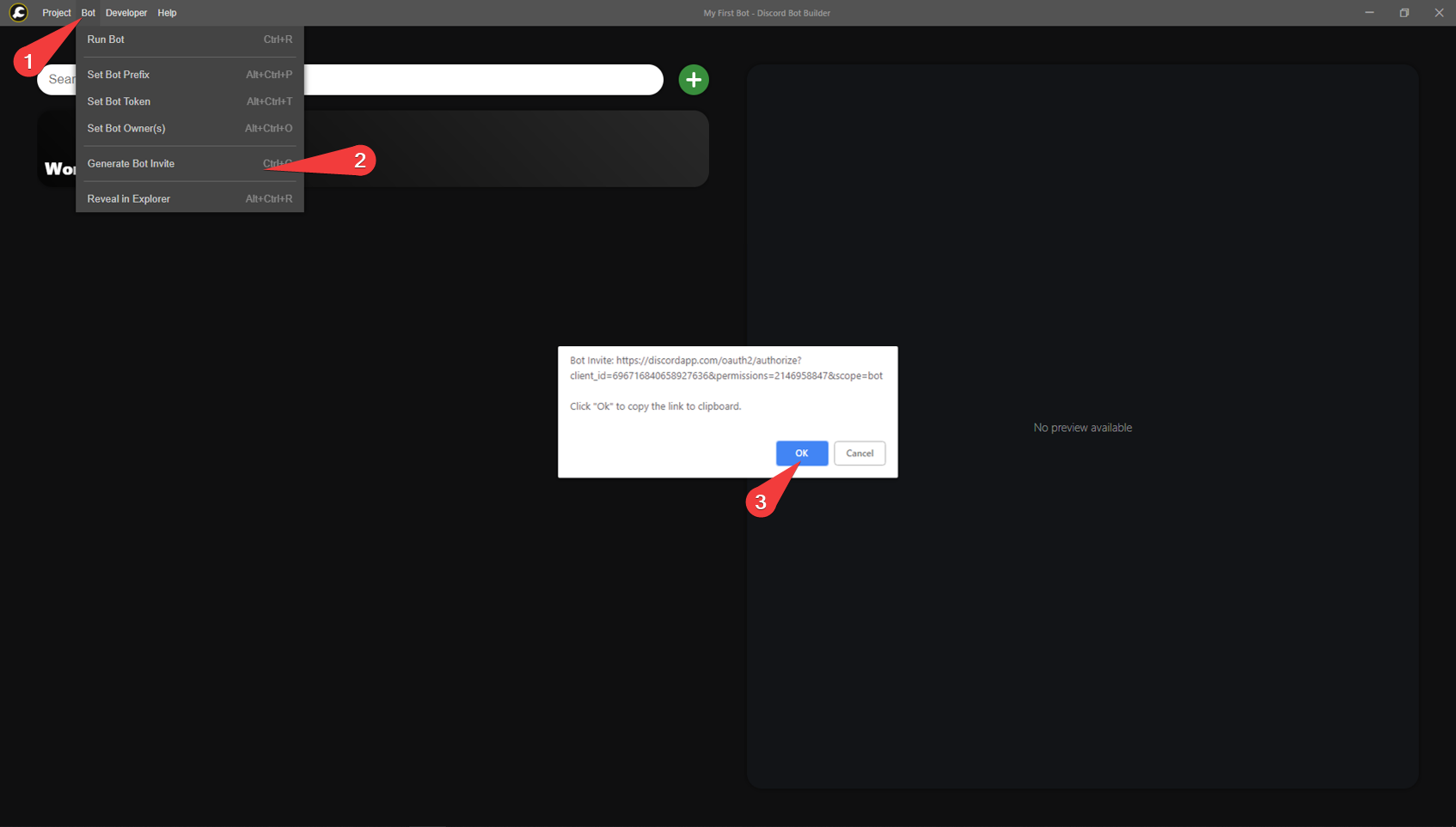 Now you need to invite the bot to your server. Get an invite link by going to the Bot menu in the toolbar at the top of the screen and selecting Generate Invite. (you could also do the keyboard shortcut Ctrl + G.)