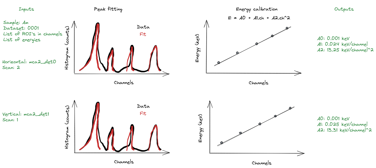To refactor: - Simplify the `fitLine` and `curveCalibration` groups to get more or less the 4 plots above - Automate peak detection: get list of emission energies from a database (e.g. pymca) and use estimation of zero and gain - External links to the raw data? - improve the `calibCoeffs` results structure