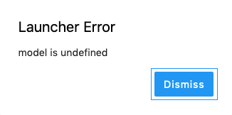 Dismisscauses another error window to pop up:Launcher Error model is undefinedI'm not sure there's anything we can do to fix this without doing a HUGE amount of work redesigning Jupyter errors, but we may want to have a comment about it in the documentation. Maybe a "FAQ" section or "Common Pitfalls"?