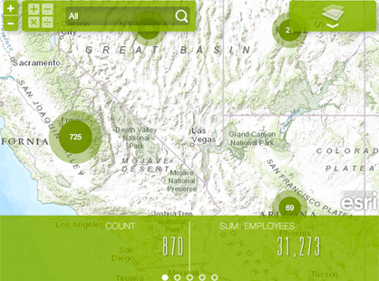 A configurable application template that summarizes the numeric attributes of features in a specific operational layer that are within the visible map area. The summaries can be configured to show the sum, average, minimum or maximum values.