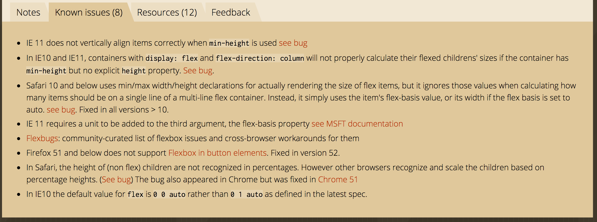 Förutom att se vilka browsers som stödjer vad kan man även se anteckningar från andra användare och samlade resurser om just den egenskapen man undersöker så som kända problem: