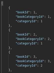 bookcategory_id, which will be a unique identifier (id) for each of the many-to-many relationships between books and categories so now, as you can see in the picture,book_id: 1andbook_id: 2both belong incategory: 1and so on. Thebookcategory_idisn't something we will actually use in an endpoint but at least it displays all the values. Before it wasn't able to do that.In the end, I only created this API to be able to use inner join to query books and categories together. It's possible all of this could have been avoided by building a query on