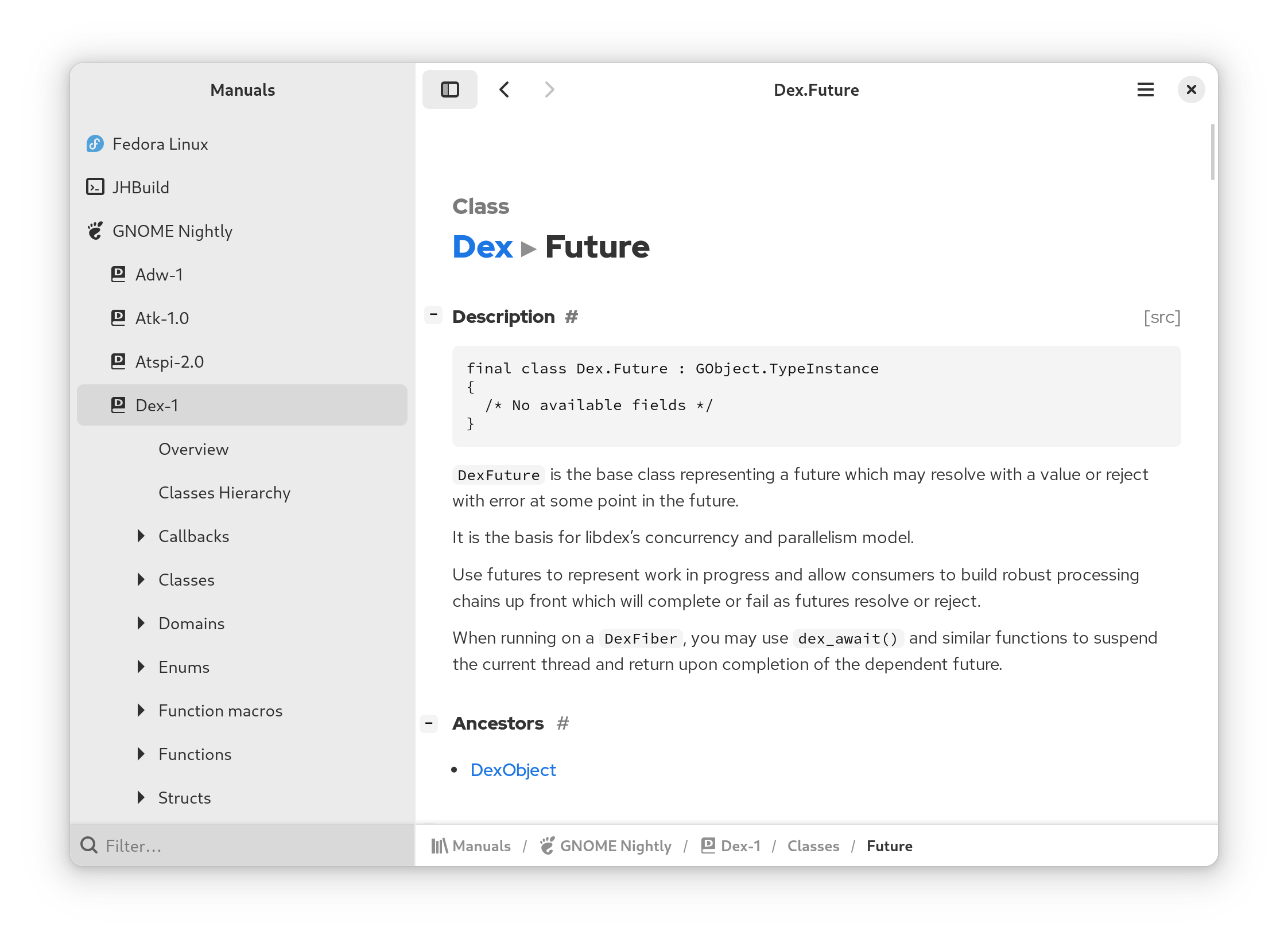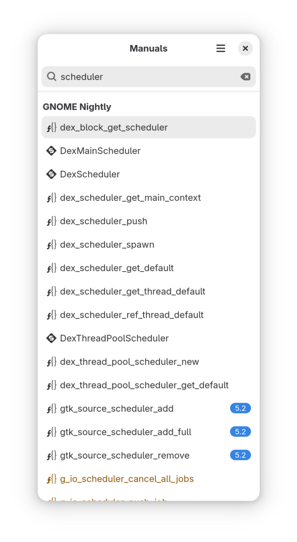 Manuals will scan your host operating system, flatpak runtimes, and jhbuild installation for documentation. Currently, the devhelp2 format is supported but additional formats may be added in the future.