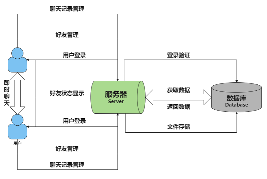 后台服务器将用户与好友的聊天记录以文件的形式存储于本地,用户无需配置数据库即可在本地导入聊天记录,以便聊天记录的查询。