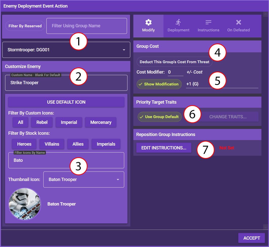 | (4) | Click this if deploying this group is supposed to cost threat. You can also set a modifier to the threat cost, such as -2. |