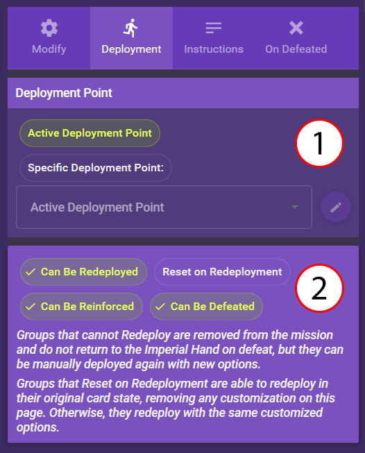 | (2) | You can decide whether this group can be reinforced, redeployed and/or defeated and whether all customizations should be reset on defeat. |