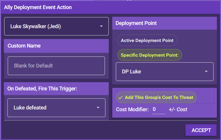 Note: If you choose to deploy any group to a Specific Deployment Point and then select None, the group is deployed without any indication of where. Use this for events like "Deploy a group within 3 spaces of the door."