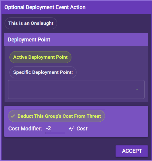 You should always activate Deduct This Group's Cost From Threat, since optional deployments usually cost threat. You can also add a modifier to the threat cost.