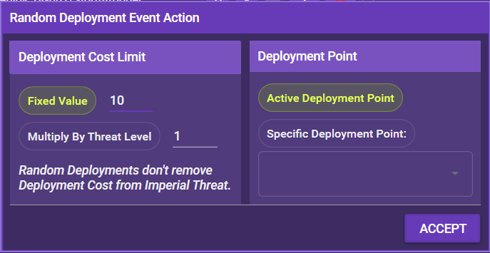 | Random Deployment | Performs a random deployment with a specific threat limit | |