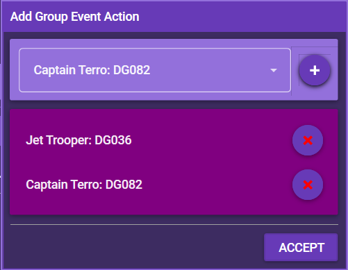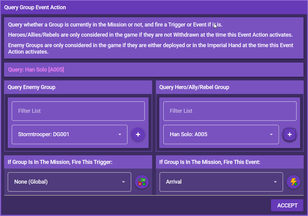 With this event action, you can make the app check if a certain group (hero, ally, enemy or villain) is currently in the mission, and fire a trigger or an event if this is the case.