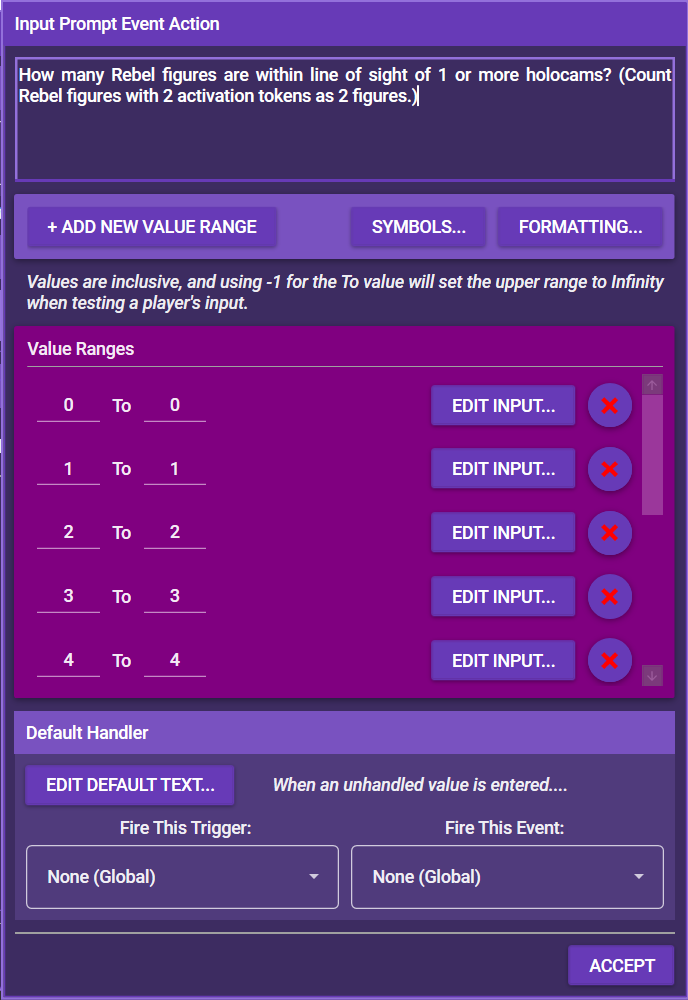 - Edit input: Each value range can have its own input. Input can be a simple text window (for example "You fail to slice the terminal"), a trigger, or an event.