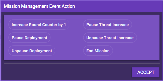 | General | Mission Management | Modify various mission parameters such as round counter, pause/unpause threat or end the mission |