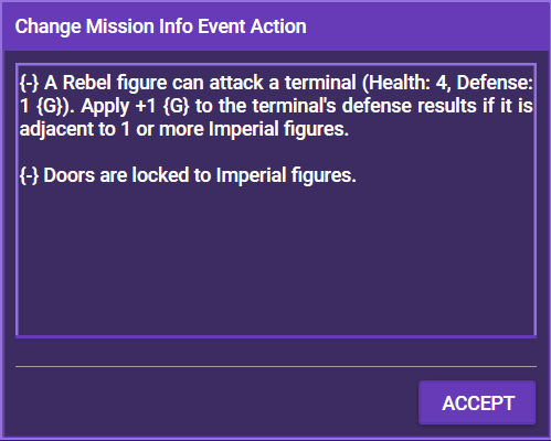 | Modify Map Entity | Activates or deactivates a map entity (such as tokens) and changes its descriptions and interactions |