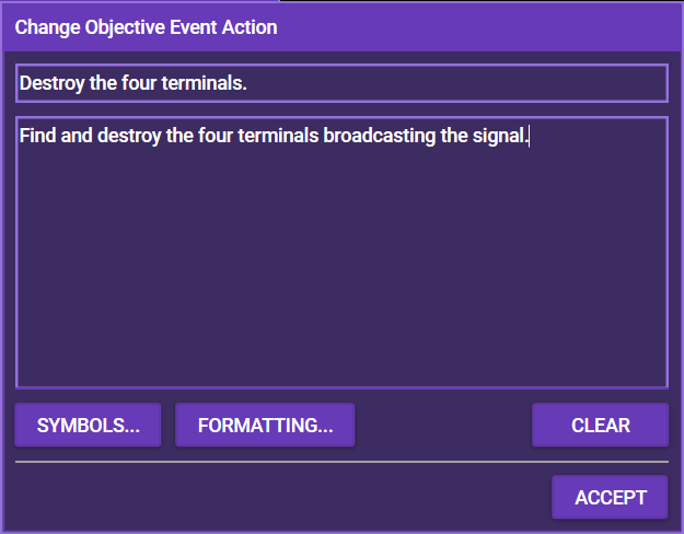 This changes the Objective that is displayed at the top of the screen as a reminder of the heroes' goals in the mission.