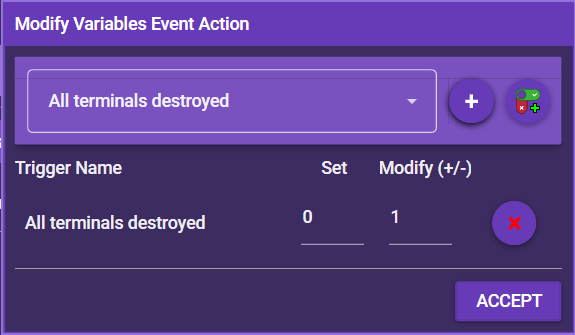 This modifies triggers / variables. Simply select a variable from the dropdown menu and add it with the + button. You can also create a new trigger / variable. In the lower half of the screen, you can choose whether to set the variable to a specific value or modify it by a certain value. Use plus/minus and the number to modify the variable, e.g. +1 or -1.