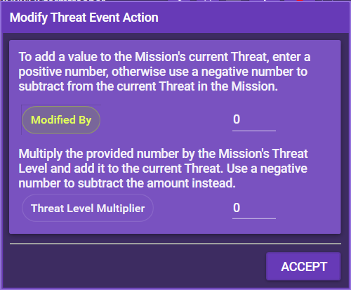 This simply modifies the current amount of threat. You can add or remove threat by either a fixed value or a modifier of the threat level (for example twice the threat level) using plus/minus.